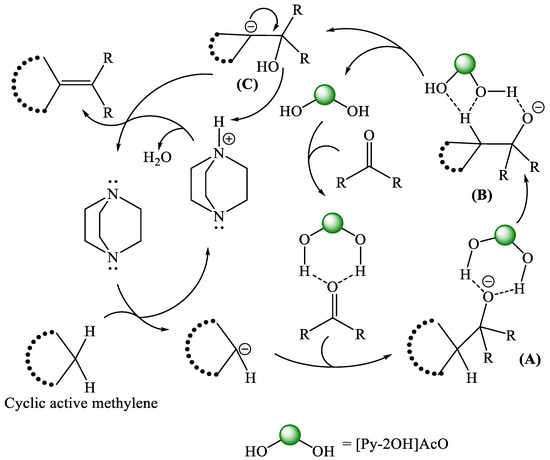 According to the obtained results, a suggested mechanism for this condensation reaction has been suggested (Scheme 8). At first, a carbanion was formed due to abstracting the acidic proton from the active methylene motif by DABCO. Simultaneously, the polarity of the carbonyl group was enhanced via hydrogen bond formation with the two-hydroxyl groups of the IL. Second, the generated carbanion underwent a nucleophilic attack at the protonated carbonyl motif, resulting in the adduct A. Furthermore, the IL accelerated the reaction through the proton transfer from the active methylene to the alkoxide (B), resulting in intermediate C. Finally, DABCO-quaternary ammonium proton facilitated the removal of a water molecule and the generation of the olefinic double bond (Scheme 8).