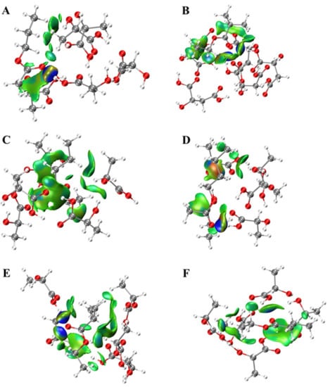 Weak interactions between esters and citric acid. (A) C2C3, (B) 2MeC3C2, (C) C4C2, (D) C2C4, (E) 3MeC4C2, (F) C5C2, H-white, C-gray, O-red.