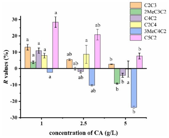 R values of esters in 1, 2.5 and 5 g/L of CA solution. Different letters indicate significant difference for each ester (p < 0.05).
