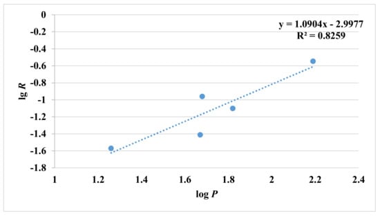 Relationship between logarithmic value of R values and log P of five retained esters in 1 g/L of CA solution.