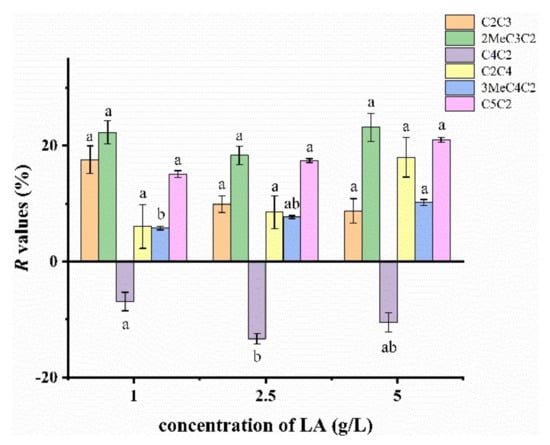 R values of esters in 1, 2.5 and 5 g/L of LA solution. Different letters indicate significant difference for each ester (p < 0.05).