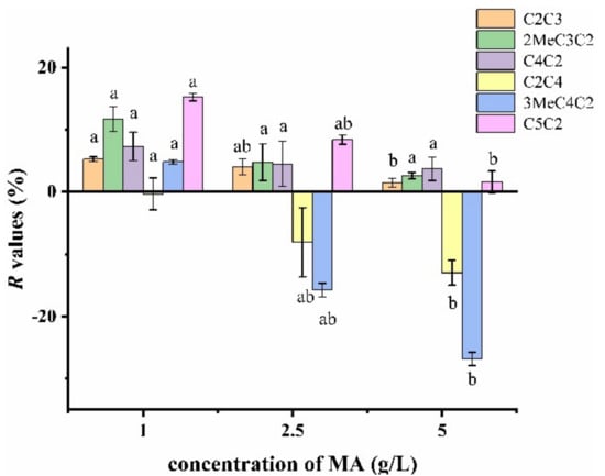 R values of esters in 1, 2.5 and 5 g/L of MA solution. Different letters indicate significant difference for each ester (p < 0.05).