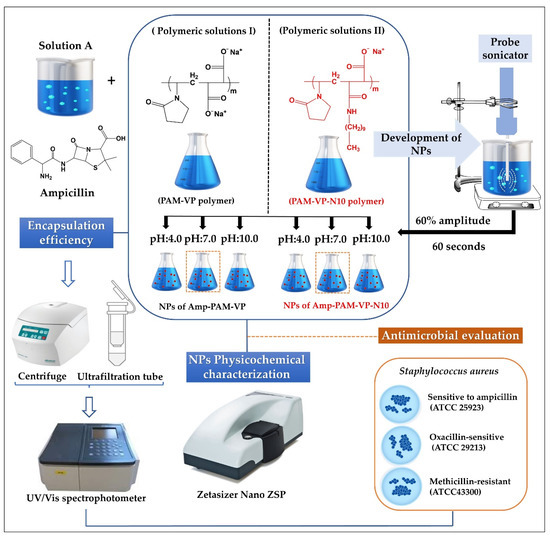 Scheme of elaboration process, physicochemical characterization, and antimicrobial evaluation of ampicillin-loaded NPs elaborated by PMA-VP and PMA-VP-N10 polymers.