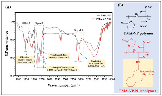 In the case of PMA-VP-N10 polymer, it is possible to observe a series of bands between 1200 and 1250 cm−1 (signal 1) and 2960 and 2800 cm−1 (signal 3) corresponding to the respective vibration and stretching of the alkyl chain from hydrophobic functionalization. In contrast, PAM-VP polymer did not describe such signals, confirming the polymeric modification in PMA-VP-N10 polymer. Regarding the carbonyl groups of both polymers, these presented several signals between 1550 and 1750 cm−1 (signal 2). In this sense, PAM-VP polymer described a carbonyl signal from the pyrrolidone ring at ~1662 cm−1 and two symmetric carbonyl signals from their carboxylate groups at ~1750 cm−1. In contrast, PMA-VP-N10 polymer described three signals corresponding to the carbonyl of the pyrrolidone ring at ~1662 cm−1 and two signals at ~1555 and ~1750 cm−1 from the amide and carboxylate groups, respectively. Finally, the comparison between the IR spectra taken recently with those taken after their synthesis fully coincided, allowing to ensure their integrity and therefore, their use for this study.