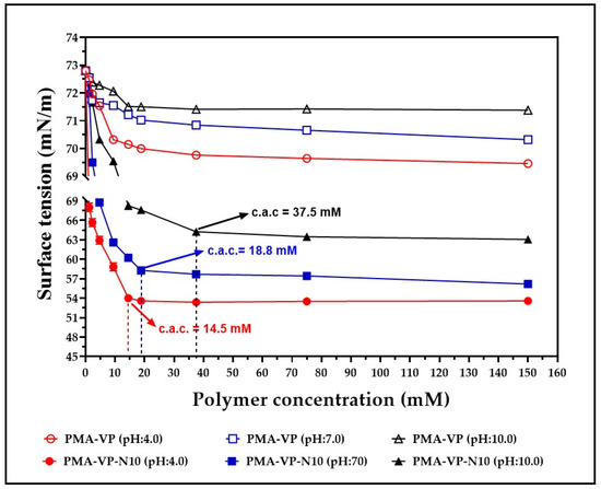 The results of the surface tension characterization of aqueous solutions of PMA-VP and PMA-VP-N10 at different polymer concentrations and medium pH values are depicted in Figure 3.