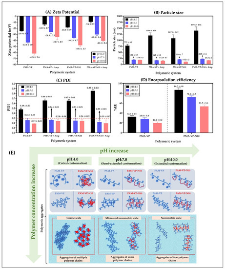 (A) Zeta potential, (B) Particle size, (C) polydispersity index (PDI), and (D) encapsulation efficiency of polymeric nanoparticles of PMA-VP and PMA-VP-N10 loaded with ampicillin at different pH values. (E) Schematization of the different conformations and aggregation forms of the polymeric chains with respect to the polymer concentration and the pH of the medium.
