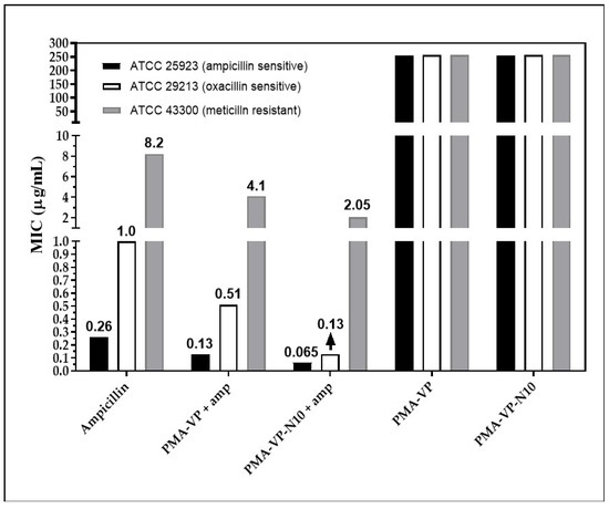 On the other hand, the polymeric NPs also exhibited antimicrobial contribution against bacteria with resistance to methicillin (ATCC 43300). Free ampicillin showed a MIC of 8 µg/mL while the PAM-VP and PMA-VP-N10 nano systems exhibited a MIC of 4 and 2 µg/mL, respectively, suggesting that PMA-VP-N10 NPs overcomes MRSA resistance. The better antimicrobial activity of alkylated versus non-alkylated polymers was discussed above. Methicillin resistance is due to a variation of the penicillin-binding protein (PBP), the PBP2a isoform, which lacks affinity for methicillin. In a previous in silico study, it was reported that some polymers have a lower affinity for PBP2a than ampicillin, suggesting that they act on another target that contributes to the antimicrobial effect against MRSA strains [5]. Thus, the antibacterial activity of polymers against MRSA strains is exerted mainly on the phospholipid bilayer of the membranes [44,45]. However, it was previously reported that polymer 2a has the ability to kill MRSA strains by increasing the expression of the recA gene, involved in the programmed cell death pathway [46]. Finally, it was revealed that the antimicrobial activity of NPs without ampicillin loading was null, suggesting a synergistic effect with ampicillin. This may be possible because a large polymer size may disfavor diffusion through the cell wall [37]. Thus, ampicillin by damaging the cell wall leads to an increase in the rate of diffusion of the polymer to reach the membrane.
