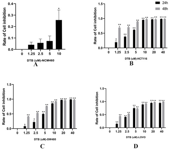 (A) The 24 h dose–response curves of DTB on normal human intestinal epithelial cells NCM460. (B) The dose–response curves of DTB on HCT116 colon cancer cells for 24 and 48 h. (C) The dose-response curves of DTB on SW480 colon cancer cells for 24 and 48 h. (D) The dose-response curves of DTB on LOVO colon cancer cells for 24 and 48 h. The abscissa is the DTB concentration and the ordinate is the rate of cell inhibition with the blank control group as a reference. n = 4; each data point represents the mean ± standard error. Compared with the blank group, * p < 0.05, ** p < 0.01.
