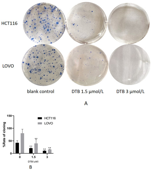 (A) The effect of DTB on colon cancer HCT116 and LOVO cells’ clone formation ability. The left is the blank control group, the middle is the DTB 1.5 μmol/L group, and the right is the DTB 3 μmol/L group. (B) Rate of clone formation. n = 3; each data point represents the mean ± standard error. Compared with the blank group, ** p < 0.01.