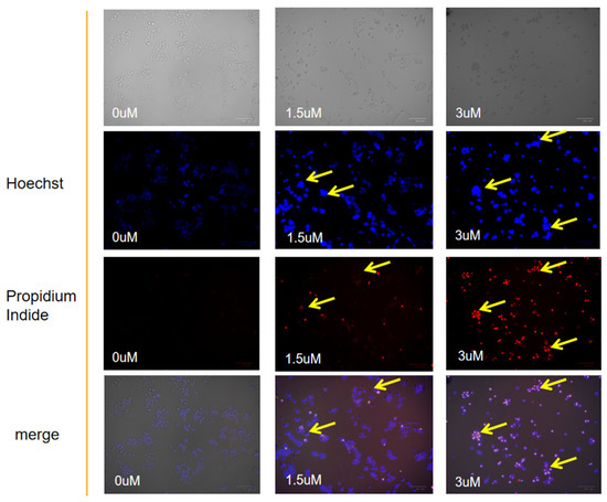 Hoechst 33342 and PI staining to observe the effect of DTB on the apoptotic morphology of human colon cancer LOVO cells. The bright blue and red coloring can be seen at the place indicated by the yellow arrow.