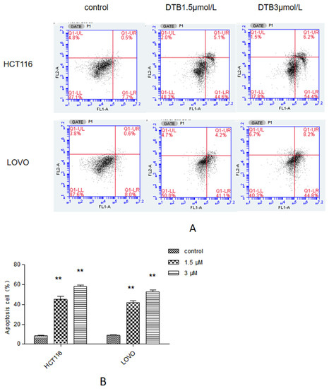 (A) Flow cytometry to detect the apoptosis rate of colon cancer cells HCT116 and LOVO after DTB intervention. (Q1-UR: the late apoptotic cells; Q1-LR: the early apoptotic cells. The abscissa is Annexin V FITC staining, and the ordinate is PI staining.) (B) Flow cytometric detection of the apoptotic rate of colon cancer cells. n = 3; compared with the blank group, ** p < 0.01, each data point represents the mean ± standard deviation.