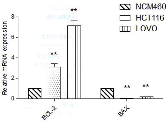 Changes in the expression of mitochondrial apoptosis-related genes BCL-2 and BAX in human normal intestinal epithelial cells NCM460 and colon cancer cells HCT116 and LOVO. n = 3; Compared with the blank group, ** p < 0.01, each data point represents the mean ± standard error.