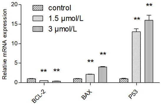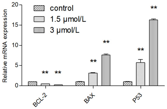 The effect of DTB on the expression of mitochondrial-related genes BCL-2, BAX, and TP53 in colon cancer cells LOVO. n = 3; compared with the blank group, ** p < 0.01, each data point represents the mean ± standard error.