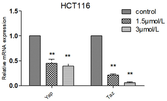 The effect of DTB on the expression of YAP and TAZ related genes of the HCT116 Hippo pathway in colon cancer cells. n = 3; compared with the blank group, ** p < 0.01, each data point represents the mean ± standard error.