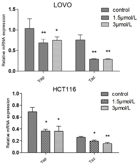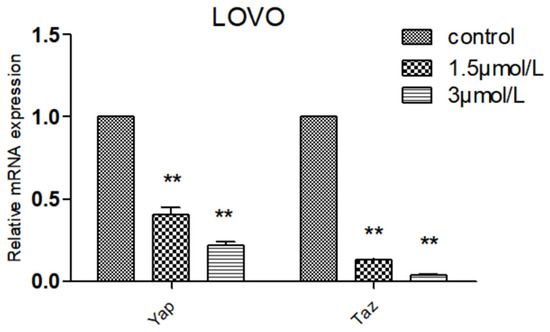 The effect of DTB on the expression of YAP and TAZ related genes of the LOVO Hippo pathway in colon cancer cells. n = 3; compared with the blank group, ** p < 0.01, each data point represents the mean ± standard error.