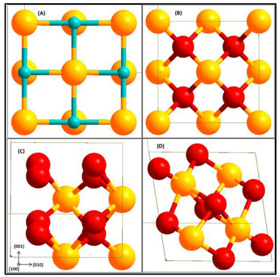 Bulk structures of ZrC (A), c-ZrO2 (B), t-ZrO2 (C), and m-ZrO2 (D). Yellow (Zr), light blue (C), and red (O).