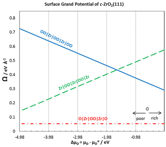 In a previous paper [4], we calculated the surface energy for a ZrC(111) surface terminating with four Zr atoms on both sides of the exposed surface at the different chemical potentials of C. The surface energy was 0.169 eV Å−2 at . In Figure 4, a stability plot is provided for the surface grand potential of each of the surface terminations of c-ZrO2(111). The surface termination O|Zr|OO|Zr|O- is observed to be the most stable. The same stable termination is found in a different theoretical work [31].