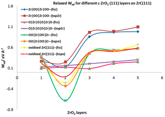 Figure 6 provides a pictorial view of the relaxed work of adhesion for all the interface models considered. There is a convergence of the work of adhesion after three layers of ZrO2 are deposited on the ZrC. The Wad values initially decrease from one layer to two layers of ZrO2 and sharply rise at three layers of ZrO2, from which point it converges. Looking at the most stable model (Zr|OO|Zr|OO—), the Wad value sharply increases from 0.251 eV Å−2 at two layers of ZrO2 to 0.965 eV A−2 at three ZrO2 layers for the on-top Zr mode of adsorption. This phenomenon is exactly the opposite of what is observed in ceramics deposited on metals where the first one and two layers of deposition are rather stronger than the deposition of three or more layers of ZrO2 [22]. Thus, the interfacial strength depends on the first three ZrO2 layers deposited. The same feature has been observed for metals deposited on ceramics where the metals are predicted to wet the ceramic surface but then ball up when more than one monolayer of metal is added [48,49,50]. The on-top interface models form stronger interface structures than the fcc models. Weak interfaces are formed when one and two layers of ZrO2 are deposited but strong interfaces are obtained when three or more layers of ZrO2 are added.