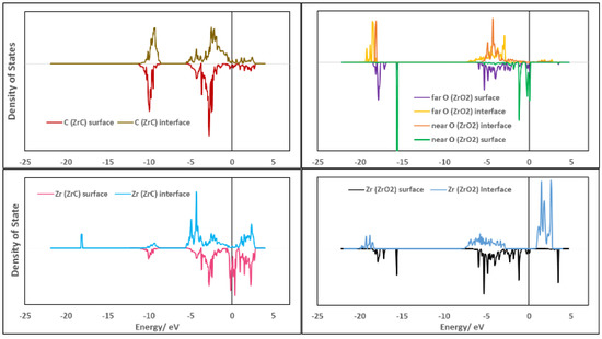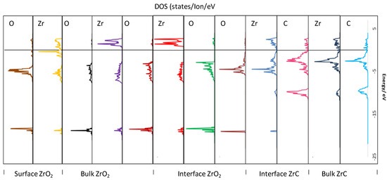 PDOS of atoms at the interface, in the bulk, and the exposed surface of the four c-ZrO2 layer interface slab (Zr|OO|Zr|OO—ZrC(111)). The states are aligned parallel to the interface plane with each region marked on the top layer. The Fermi level is aligned at the zero energy position.
