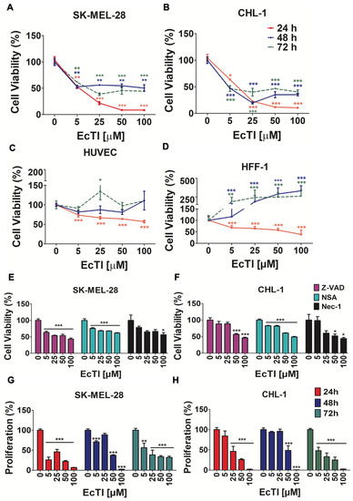 Cell viability and proliferation. Cell viability of SK-MEL-28 (A), CHL-1 (B), and non-tumorigenic HUVEC (C) and HFF-1 (D) was measured with increased concentrations of EcTI (5, 25, 50, and 100 µM) after 24, 48, and 72 h of treatment. Co-treatment with apoptotic and necrotic inhibitor was evaluated after 24 h of incubation with Z-VAD (20 µM), NSA (0.2 µM), and Nec-1 (5 µM) in SK-MEL-28 (E) and CHL-1 (F) cells and demonstrated the alteration of Z-VAD and Nec-1, especially. Proliferation assays were estimated by BrDU uptake in SK-MEL-28 (G) and CHL-1 (H) cells after 24–72 h of EcTI treatment. Percentage values were normalized to control cells (0). The bars represent means and SDs. Significance reflected: * p < 0.05, ** p < 0.005, and *** p < 0.0005.