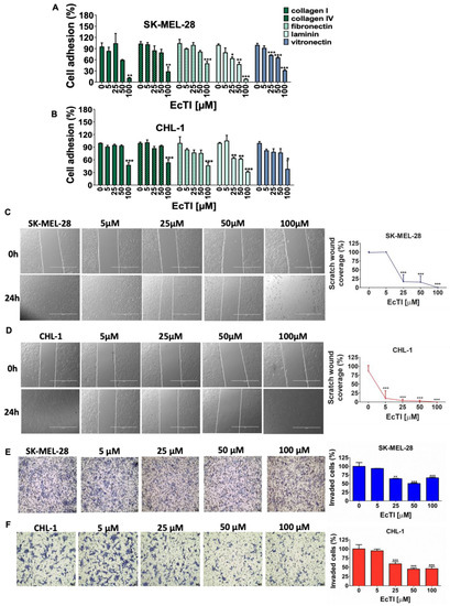 Actin cytoskeleton interactions are essential for metastasis formation because tumor cells migrate, invade, and then spread to surrounding tissues. Thus, cell adhesion proteins are required to promote these processes, and inhibitors are used as potential anti-cancer tools [16,17,18]. To verify the effect of EcTI on cell adhesion, an important hallmark of cancer, EcTI (100 µM) interfered with adhesion mediated by collagen I, collagen IV, fibronectin, laminin, and vitronectin. Importantly, the reduction in SK-MEL-28 adhesion to laminin and vitronectin (Figure 2A) and CHL-1 to laminin (Figure 2B) was remarkable.