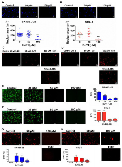 Nuclear morphology, PI uptake, calcium release, and mitochondrial membrane potential. Cell morphology to detect nuclear alteration in SK-MEL-28 cells (A) and CHL-1 (B) was determined using Hoechst staining after EcTI incubation for 24 h; pyknotic nuclei and nuclear shrinkage were observed after incubation with 100 µM of EcTI. Loss of membrane integrity was calculated using PI fluorophore after incubation with 50 and 100 µM of EcTI; extra fluorescence cells (particularly after incubation with 100 µM of EcTI) were seen in SK-MEL-28 (C) and CHL-1 (D) (scale bar 20 µm). Triton X-100 (0.01% v/v) was used as a positive control of cell death. The effect of EcTI on calcium release was observed through fluorescence microscopy and using a microplate reader in the FLUO-4AM direct assay. The compound provoked a decline in melanoma cell fluorescence, as seen via microscopy after incubation with 25, 50, and 100 µM of EcTI ((E) SK-MEL-28 and (F) CHL-1, scale bar 10 mm). The effect was confirmed using the microplate reader at 485 nm excitation/530 nm emission and expressed using a relative fluorescence unit (RFU). Mitochondrial membrane potential was also analyzed through fluorescence with TMRE staining; a disruption in mitochondria stimulated by pore opening in SK-MEL-28 (G) and CHL-1 (H) was observed (scale bar 20 µm). FCCP: 50 µM (carbonyl cyanide 4-((trifluoromethoxy) phenylhydrazone) and CTCF: integrated density— (area of selected cell × mean fluorescence of FCCP readings). The bars represent means and SDs. Significance was considered as * p < 0.05, ** p < 0.005, and *** p < 0.0005.