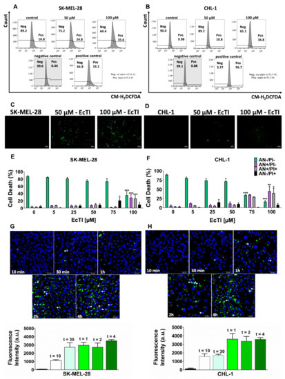 ROS production, caspase-3/7 activity, cell death, and EcTI internalization. Intracellular reactive oxygen species (ROS) were measured using 2,7-dichlorodihydrofluorescein diacetate (CM-H2DCFDA), and fluorescence was measured using flow cytometry with an FL1-H channel on a BD Accuri C6 flow cytometer (BD, Los Angeles, CA, USA) and Flow Jo 10 software. EcTI induced ROS production in both human melanoma cells lines, (A) SK-MEL-28 and (B) CHL-1, as seen in the histograms. The negative control was melanoma cells without CM-H2DCFDA staining, and the positive control was 500 µM H2O2. The y-axis represents cell counts, and the x-axis represents the intensity of green fluorescence (ROS). Neg: no stain in FL1-H; Pos: stain in FL1-H. The action of EcTI on caspase-3/7 activity was demonstrated using DEVD polypeptide substrate after EcTI incubation for 24 h; an increase in cell fluorescence after treatment with 100 µM of EcTI in both SK-MEL-28 (C) and CHL-1 (D) was observed. Melanoma cell death in SK-MEL-28 (E) and CHL-1 (F) was investigated through flow cytometry, using fluorophores annexin-FITC (AN) and propidium iodide (PI), after EcTI incubation (5, 25, 50, 75, and 100 µM) for 24 h. AN−/PI− indicates viable cells; AN+/PI− indicates early apoptotic cells; AN+/PI+ indicates early apoptotic cells; AN−/PI+ indicates necrotic cells. The control is represented by “0”. The effect of EcTI on cell internalization after 10 min, 30 min, 1 h, 2 h, and 4 h ((G) SK-MEL-28 and (H) CHL-1) was analyzed via EcTI conjugation with AlexaFluor488 and nuclear Hoechst staining, where compound internalization became gradually visible over time. The bars represent the mean and SD. Significance was considered as * p < 0.05, ** p < 0.005, and *** p < 0.0005.