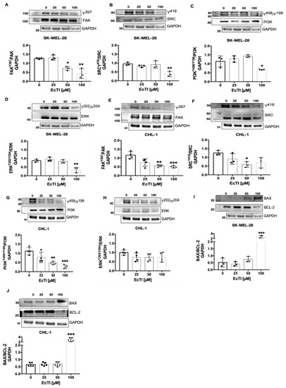 Survival and apoptotic-related proteins. The action of EcTI on different proteins related to cell survival and apoptosis in human melanoma cells is depicted. The proteins in panels (A–H) are associated with cell proliferation, migration, and invasion, while those in panels (I,J) are associated with cell death. EcTI interfered with FAK (A), SRC (B), PI3K (C), and ERK (D) in SK-MEL-28 cells and with FAK (E), SRC (F), and PI3K (G) in CHL-1 cells; however, ERK (H) was not affected in CHL-1 cells. Furthermore, EcTI affected the expression of the cell death protein BAX/BCL-2 in both SK-MEL-28 (I) and CHL-1 (J) cells. The graphs are provided in arbitrary units (a.u.), and all proteins except for the phospho-total ratio were normalized with the housekeeping protein, GAPDH. The control is represented by “0”. The bars represent means and SDs. Significance was considered as * p < 0.05, ** p < 0.005, and *** p < 0.0005.
