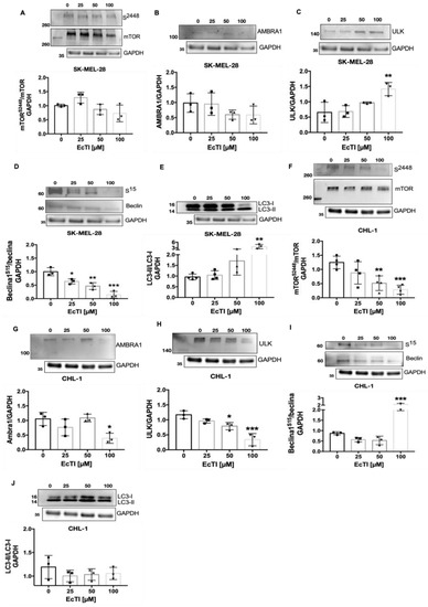 Autophagy-related proteins. The action of EcTI on different proteins related to the autophagic process is depicted in panels (A–J). EcTI affected autophagy protein levels. Although no alterations were observed in mTOR (A) and AMBRA (B), EcTI impaired ULK (C), BECLIN (D), LC3-II/I (E) in SK-MEL-28 cells. In CHL-1 cells, EcTI induced changes in mTOR (F), AMBRA (G), ULK (H), and BECLIN (I); however, no alteration was visible on LC3-II/I (J). The graphs are provided with arbitrary units (a.u.), and all proteins except for the phospho-total ratio were normalized with the housekeeping protein, GAPDH. The control is represented by “0”. The bars represent means and SDs. Significance was considered as * p < 0.05, ** p < 0.005, and *** p < 0.0005.