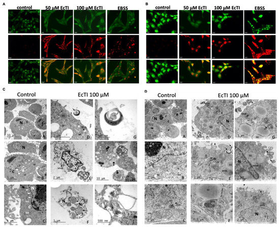 Acidic vesicular organelle formation and transmission electron microscopy. Cells were incubated with 50 and 100 µM EcTI for 24 h or EBSS medium for 3 h (positive control). After treatment, SK-MEL-28 (A) and CHL-1 (B) cells were stained with 0.5 μg/mL acridine orange (AO) for 15 min. EcTI intensified AO-stained red fluorescent-positive acidic vesicular organelles. The representative images, from three independent experiments, were observed under the same magnification, and the scale bar (25 μm) is presented in each. The impact of EcTI on SK-MEL-28 (C) cell morphology was analyzed through electron microscopy after 24 h of incubation; low magnification (10 µm) of control SK-MEL-28 cells (panel A) exhibits a typical morphology. At higher magnification (5 µm and 1 µm), the presence of healthy mitochondria (M), rough endoplasmic reticulum (RER), free poly-ribosomes (R), healthy cytoplasm (C), nucleus (N), and nuclear membrane (white arrowheads) in (panels B and C) is observed. (Panels D and G) show low magnification of EcTI-treated SK-MEL-28 cells (2 µm) presenting apoptotic bodies (long arrows) in high magnification (500 nm). (Panel E) and (panel F) show global shrinkage and disrupted cytoplasm, without affecting the nuclear membrane, which was notably intact (N). In (F), mitochondria in the stage of degeneration (M) are characterized by cristae disorganization (long arrows). (E, H and I) Autophagic vesicles (short arrows, AV), multivesicular bodies (MVB), and secretory granules (SG) were present in SK-MEL-28 EcTI-treated cells. (D) The impact of EcTI on the morphology of CHL-1 control cells (panel A) after 24 h of incubation, analyzed using electron microscopy at low magnification (10 µm), exhibits a typical morphology. At higher magnification (2 µm), the presence of healthy mitochondria (M), rough endoplasmic reticulum (RER), free poly-ribosomes (R), Golgi apparatus (GOL), healthy cytoplasm (C), nucleus (N), and nuclear membrane (white arrowheads) is observed in (panels B and C). In EcTI-treated CHL-1 cells, the presence of multivesicular bodies (MVB) increases in (panels D and G). In (panels E and I), apoptotic bodies are present (white long arrows) and the nuclear membrane is intact (N). The late stage of mitochondrial degeneration can be observed in (panel E, panel G, and panel H), where the mitochondria are mostly rounded and empty with small electron-dense masses (long arrows). EcTI-treated cells are also rich in autophagic vesicles (AV), secretory granules (SG), and multivesicular bodies (MVB) (panel D–I). Significance was considered as * p < 0.05, ** p < 0.005, and *** p < 0.0005.