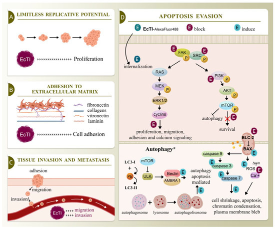Signaling pathways of cancers include limitless replicative potential, adhesion to the extracellular matrix, tissue invasion and metastasis, and apoptosis evasion. (A) EcTI inhibits the replicative potential of melanoma cells, interfering with components of the extracellular matrix and reducing melanoma cell adhesion (B), which blocks melanoma migration, invasion, and metastasis (C). These events are mediated by the impairment in apoptosis evasion, interfering with proteins associated with proliferation, migration, adhesion, and calcium (Ca2+) signaling and those associated with the autophagy/apoptosis pathways, leading to cell shrinkage, chromatin condensation, plasma membrane blebbing, reactive oxygen species production (ROS), mitochondrial membrane potential disruption (Δψm), and apoptosis of melanoma cells (D). These findings together indicate the deleterious effect of EcTI on the SK-MEL-28 and CHL-1 cell lines by distinct pathways.