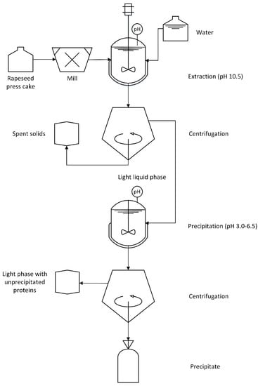 - Fetzer, A.; Herfellner, T.; Stäbler, A.; Menner, M.; Eisner, P. Influence of process conditions during aqueous protein extraction upon yield from pre-pressed and cold-pressed rapeseed press cake. Ind. Crop. Prod. 2018, 112, 236–246. [Google Scholar] [CrossRef]