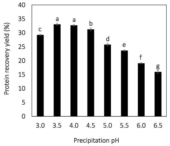 The protein recovery yield describes how large the proportion of the proteins in the starting material, the rapeseed press cake, obtained in the precipitated fraction is. High protein recovery yields correlated with low precipitation pH, with a maximum around pH 3.5–4.0 (33 ± 0%, Figure 2), and at even lower pH, the yield again decreased. The protein recovery yield is correlated to both the extraction pH and precipitation pH [38]. This is because the two process steps are linked: only the protein that was solubilized in the first step of the process can be precipitated in the second step since the non-solubilized protein is left behind in the spent solids fraction. In a study by Gerzhova et al., 3 different extraction pH (pH 10–12) were investigated and the protein recovery yield was 25, 35, and 55% [39], which is in agreement with the present study. Akbari and Wu reported a yield of 51% when rapeseed protein was extracted at pH 12 and precipitated at pH 4–4.5 [26].