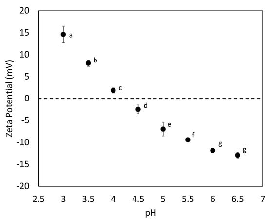 The zeta potential of the light liquid phase precipitated at different pH was evaluated and the zeta potential was 0 at pH 4.2 (Figure 3), indicating that this should be the pI for the rapeseed protein composition used in the present study. The results agree with the protein recovery yield, with an optimum pH of 3.5–4.0 (Table 1). In this pH interval, the proteins’ surface has a neutral net charge, and the proteins cannot repel each other by electrostatic repulsion. The proteins, therefore, associate in larger clusters and are subjected to forced sedimentation during centrifugation. The results thus indicate that the pI for the protein mixture of the used material is around 4.0. This result is in line with a study performed by Gerzhova et al., where the pI of hot-pressed canola meal was evaluated, and the zeta potential was found to be 0 around pH 4.3 [39]. Moreover, this result is in line with other studies reporting that the lowest solubility for rapeseed protein is in the range of pH 3.7–4.0 [40]. A close botanical relative to rapeseed, Brassica carinata, was reported to have the lowest protein solubility between pH 3.5 and 5 [41].