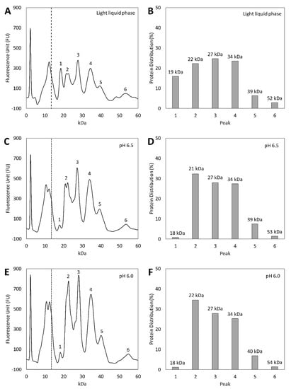 The same trend of an increased peak in the light phase with unprecipitated proteins compared to the light liquid phase was followed for the third (27–28 kDa) peak. The molecular mass represented by this peak is a possible match with the molecular weight of the oil body protein caleosin (27 kDa) [13]. This peak represented 25% of all proteins in the light liquid phase (Figure 4A,B) and around 29% in the light phase with unprecipitated proteins at pH 4.0, 5.5, 6.0, and 6.5 (Figure 4C,D,G–N). For pH 4.5, this peak was slightly higher in the light phase with unprecipitated proteins: 34% (Figure 4E,F).