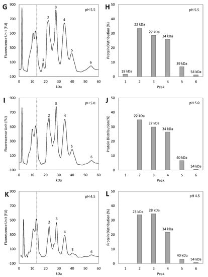 The protein represented by the fourth peak (34 kDa) lines up with the α-chain of cruciferin (29–33 kDa) [23] and represented 24% of all proteins in the light liquid phase (Figure 4A,B). For pH 4.0 and 4.5, it can be seen that the peak height was reduced, with only 18% of all proteins at pH 4.0 (Figure 4D). This indicates that a large amount of the proteins represented in the fourth peak precipitated at these pH. At the remaining pH, the peak was somewhat higher in the light phase with unprecipitated proteins compared to the light liquid phase. The second and fourth peaks also support the findings from a study performed by Qu et al., where SDS-page was used to characterize the profile for rapeseed proteins. Their result showed that the α and β-chains of cruciferin were in the same molecular weight range [43].
