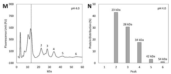 The second peak (21–23 kDa) was detected in both the light liquid phase (Figure 4A,B) and the corresponding light phase with unprecipitated proteins at all precipitation pH (Figure 4C–N). The molecular mass of the second peaks lines up with the weight of the β-chain from cruciferin (20–23 kDa) [23]. The protein distribution (Figure 4A,B) shows that the second peak represented 22% of all proteins in the light liquid phase, but for light phases with unprecipitated proteins at precipitation pH 4.5–6.5, this particular peak was estimated to be around 34% (Figure 4E–N). The intensity of this peak was the highest for the light phase with unprecipitated proteins at pH 4.0, with 43% of the total protein in the light phase with unprecipitated proteins (Figure 4C,D). This indicates that the proteins with subunits with a molecular weight of 21–23 kDa had a higher solubility than average in the light liquid phase and did not precipitate to the same extent as other proteins.