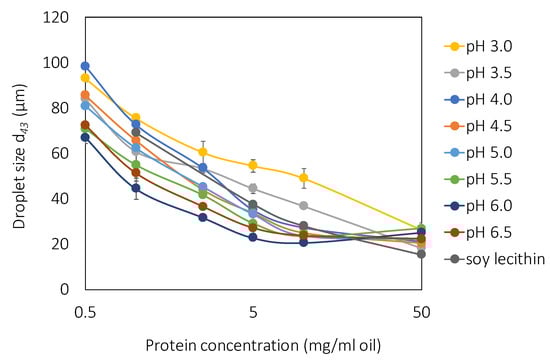 Zhang et al. reported that the emulsifying activity and stability of rapeseed protein was maximum when precipitated at pH 3 [36]. When protein was precipitated at higher pH, the emulsifying activity and stability decreased. The different outcome is possibly due to both the different extraction conditions and emulsion formulations. Zhang et al. used pH 9 as the extraction pH and used 0.1% (w/v) protein in the emulsion formulation. This is a lower protein concentration than the present study, which investigated protein concentrations of 0.5–25% (w/v) and found that a plateau, after which no further reduction in droplet size occurred, was reached at 5% w/v (or 10 mg protein/mL oil).