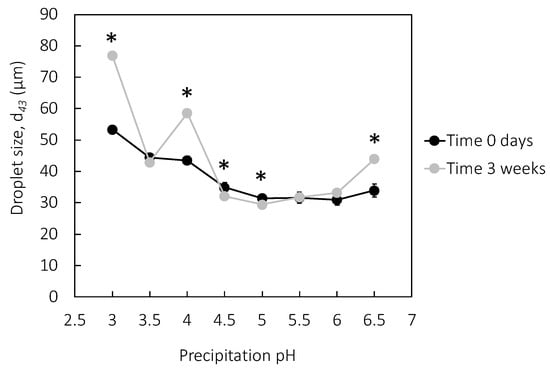 Emulsion droplet size immediately after formulation and after 3 weeks of storage at 30 °C. the emulsifier concentrations in the emulsions were 10 mg protein/mL oil. Star indicates significant differences in droplet size between time 0 and after incubation for 3 weeks, p < 0.05.