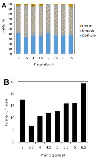 Figure 7A presents a schematic illustration of the samples after 21 days of storage. A larger clarification layer due to the free oil at the top part of the cell was observed for emulsions stabilized by rapeseed protein precipitated at low pH (from 3.0 to 4.5) and pH 6.5. The precipitation pH from 5.0 to 6.0 showed the largest stability and the thinnest layer of free oil on the top part of the cell. The presence of free oil also agrees with the larger particle size measured in Turbiscan after 3 weeks of storage as presented in Figure 6.