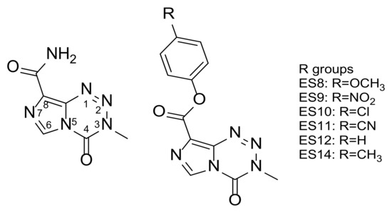The antiproliferative effects of the phenolic ester and amide analogues synthesised from TMZ have been evaluated against specific glioma cell lines and patient-derived primary cultures [18]. A number of these phenolic TMZ esters analogues (ES8–ES12 and ES14) were found to have an up to five-fold increased activity against specific GBM cell lines, when compared to TMZ (Figure 1). Furthermore, the lead phenolic TMZ esters were found to induce significant antiproliferative effects against TMZ-resistant O6-methylguanine-DNA methyl transferase (MGMT)-positive primary cells. These findings were encouraging, since they indicated that these phenolic TMZ esters could potentially provide an alternative treatment for patients diagnosed with GBM [18].