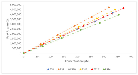 Comparative calibration curves for six TMZ ester analogues, highlighting the relationship between the concentration and the peak area (PA). Relative regression equations and R2 values are shown in Table 2.