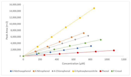 Acetonitrile (HPLC grade: ≥99.9%), water (HPLC grade: ≥99.9%), acetic acid (HPLC grade: ≥99.7%), citric acid monohydrate (HPLC grade) and dimethyl sulfoxide (reagent grade) were purchased from Fisher Scientific, Horsham, UK. Sodium phosphate dibasic (HPLC grade: ≥99.0%), sodium acetate (HPLC grade: ≥99.0%), phenol (reagent grade: >99%) and p-cresol (reagent grade: >98%) were purchased from Sigma-Aldrich, Gillingham, UK. PLE was purchased from Sigma-Aldrich, St. Louis, MO USA. 4-Nitrophenol (reagent grade: >97%), 4-Chlorophenol (reagent grade: >98%), 4-Hydroxybenzonitrile (reagent grade: >97%) and 4-Methoxyphenol (reagent grade: >99%) were sourced from Alfa Aesar, Haverhill, MA, USA. All reagents sourced from external suppliers were used without further purification. The TMZ esters were synthesised, purified and characterised following standard procedures [18]. The purity of each synthesised TMZ ester was also estimated to be at least 95%, using 1H NMR.