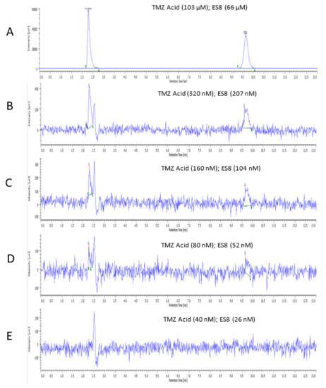 Shows an example of how the LLOQ and the LLOD were determined. Chromatogram (A) was included in order to provide a comparison and identify the peak responses at low concentrations. Chromatogram (B), with TMZ acid (320 nM) and ES8 (207 nM) with retentions times of 2.3 and 9.7 min, respectively, was estimated to be the LLOQ for both TMZ acid and ES8. Chromatogram (C) represented a one-in-two dilution of the LLOQ. Chromatogram (D), with TMZ acid and ES8 at the concentrations of 80 and 52 nM, respectively, was estimated to be the LLOD. Chromatogram (E) represented a one-in-two dilution of the LLOD concentration and clearly indicated the absence of both the TMZ and ES8 analytes. The analysis was carried out at a wavelength of 325 nm.