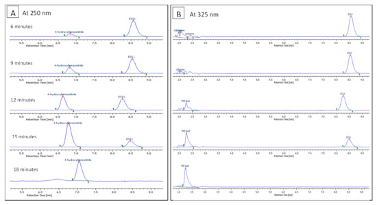 A series of chromatograms showing the monitored degradation of ES11 into its corresponding TMZ acid and 4-Hydroxybenzonitrile. Each series of chromatograms showed a different wavelength, allowing all analytes to be visualised. (A) Breakdown of ES11 and the formation of 4-Hydroxybenzonitrile (250 nm). (B) Breakdown of ES11 and the formation of TMZ acid (325 nm).