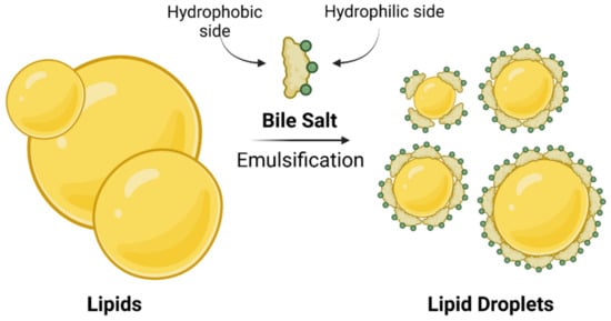 After meal ingestion, but also following olfactory or visual sensing of food, BAs are excreted from the gallbladder into the duodenum, where they participate in the absorption of lipids and lipid-soluble vitamins by acting as biosurfactants [1,112,113]. Specifically, they mainly interact with the predominant dietary lipids—triacylglycerols, phospholipids, and cholesterol esters—breaking down large lipid droplets into smaller ones, which significantly increases their surface area, making them more accessible to lipases [112,114]. This process can only occur if BAs are above a critical micelle concentration (CMC). Conjugated BAs are strong acids with pKa value of 2 for taurine and 4 for glycine conjugates, while the intestinal pH normally exceeds 5, making the BA salts fully ionized. This prevents them from penetrating the cell membranes of enterocytes and thus enables reaching the CMC. Moreover, molecules of BA salts are too large to pass across paracellular junctions [1,115].
