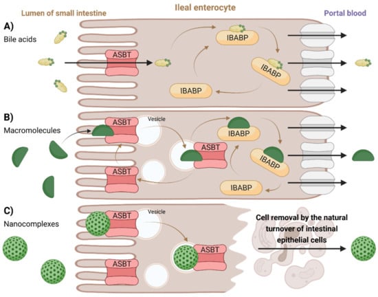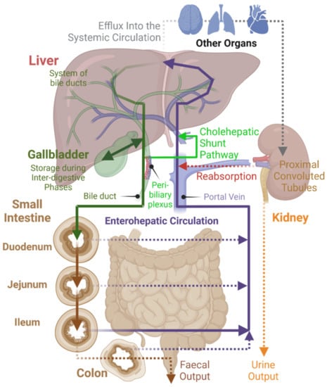 From a general point of view, enterohepatic circulation allows for the recycling of metabolized and non-metabolized compounds [47]. It involves the passage of substances that have been absorbed from the intestines via the portal vein to the liver and their subsequent passage via the biliary system back into the intestine [48]. The transport of BAs between organs has been mostly studied using genetically engineered mice models with targeted inactivation of genes of interest. For example, bile salt export pump (BSEP) is involved in the BA transport in the canalicular membranes of liver, and the knockout of bsep gene in mice resulted in intrahepatic cholestasis [18,49].