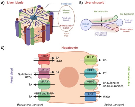 Illustration of: (A) liver lobule, (B) liver sinusoid, and (C) transport proteins and processes described to be taking place in hepatocytes. Created with BioRender.com.