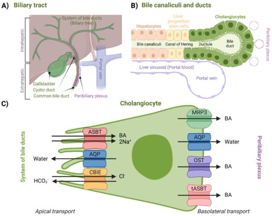 Regarding BA transport, the peribiliary plexus (Figure 5A) is an important component of the biliary tract. Through the plexus, BAs can be cycled back to the hepatocytes after being absorbed by cholangiocytes. After being cycled to the hepatocytes, BAs are then once again excreted across the canalicular membrane. This process is called the cholehepatic shunt pathway and it allows for an increased BA biliary transit time, increased bile flow for each BA molecule secreted, and increased biliary lipid secretion [97]. For example, in the case of cholestasis, the cholehepatic shunt pathway appears to be an important pathophysiological response which creates an alternative method for the absorption and recycling of BAs, which then in turn compensate for the ileal absorption [52,92]. As far as physiological relevance is concerned, cholangiocyte BA uptake might be more important for signaling—triggering adaptive intracellular responses, e.g., regulation of cholangiocyte secretory activity. This was suggested by the fact that the cholangiocellular apical sodium-dependent bile acid transporter (ASBT) does not appear to be a high-throughput system for physiological BAs [52,98]. An overview of specific proteins responsible for this transport can be seen in Figure 5.