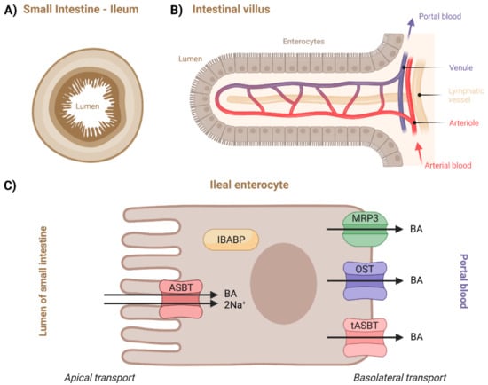 BAs are not actually essential to the digestion of dietary fats but are necessary for their effective or complete absorption [1,116,117]. Detailed steps leading to intestinal fat absorption are not yet completely understood, but we know that different pathways are taken by different types of lipids [114,118]. Lipases hydrolyze the lipids into fatty acids and respective monoacylglycerols, lysophospholipids, and free cholesterol [112,117]. Hydrolyzed products are taken up by enterocytes, which then resynthesize lipids and package them into chylomicrons for secretion. Subsequent hydrolyzation of these lipids can occur during blood circulation, which provides energy in the form of free fatty acids. Remaining lipidic particles are removed from circulation by the liver [114]. Once the BAs perform their function in this process, approximately 95% of them are reabsorbed and shuttled across the enterocytes to the basolateral membrane, effluxed into the portal vein, and continue towards liver within the enterohepatic circulation [1,112,119]. This happens by a combination of absorption in the duodenum and jejunum, active transport in the distal ileum, and passive absorption in the colon [119]. Although unconjugated BAs with higher pKa values can be freely transported by passive diffusion, this only accounts for a small fraction of their transport [112]. The terminal ileum (Figure 6) is the primary site of BA reabsorption in humans [119,120]. In the proximal small intestine, both passive and active transport were suggested to take place [119]. The contribution of jejunal uptake is still debated, but it seems to be possible based on the evidence coming mostly from in vivo rat studies [119,121,122]. Similar to the jejunum, the duodenum is also hypothesized to be capable of BA transport, but there is a lack of studies on humans [119,123].